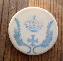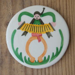 | *陶製コースターのサイズ* 直径 : 約 11.5cm 高さ : 約 1cm ◆裏面にホールが2つ開いていますので、ヒモを通して壁にかけることができます。 ◆高さ 3 mm ほどのコースター用の高台がついています。 ◆薄いベージュの地色で、表面には透明感のある釉薬がかけられています。 |