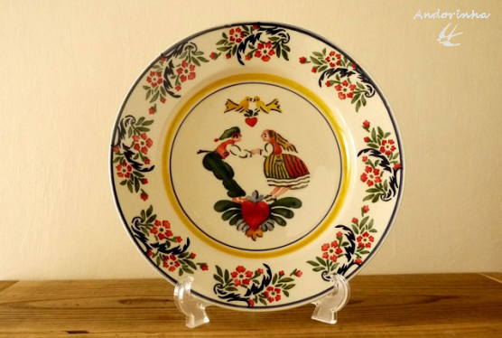 頭上に飛ぶ小鳥までペアで楽しげです。ふちの模様はポルトガルでジニアスと呼ばれるお花です。