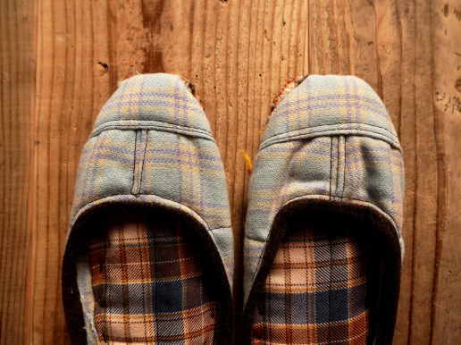ライトブルーのチェックにブラウンを合わせて。 冬らしい色合い。 ソールはフェルト風の生地が縫い付けてあります。